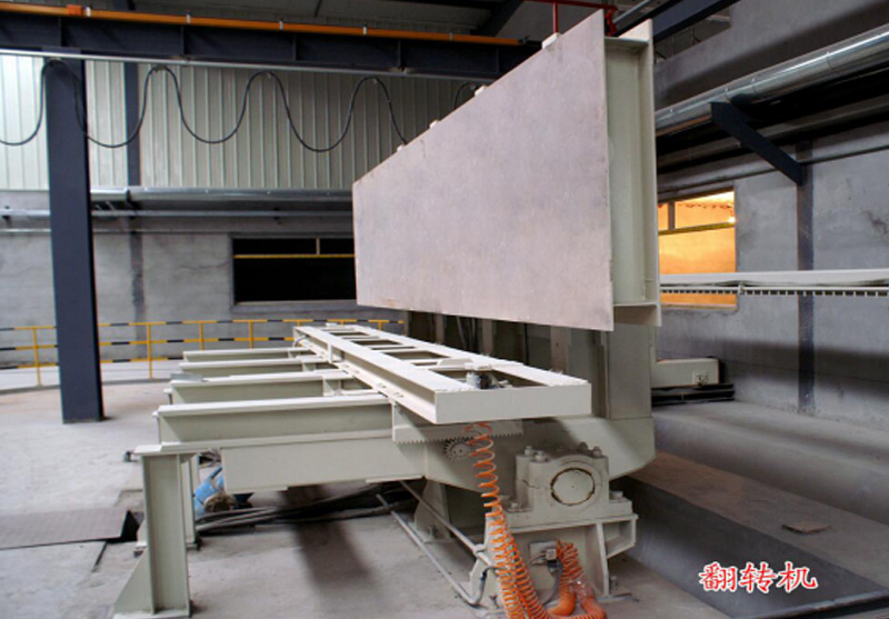 加氣磚成套生產(chǎn)線中用到的一種翻轉(zhuǎn)設(shè)備,翻轉(zhuǎn)臺,主要是加氣線里面,切割完成后,坯體經(jīng)由翻轉(zhuǎn)臺90度翻轉(zhuǎn),再刮廢料機(jī)刮除坯體頂部和底部的廢料。