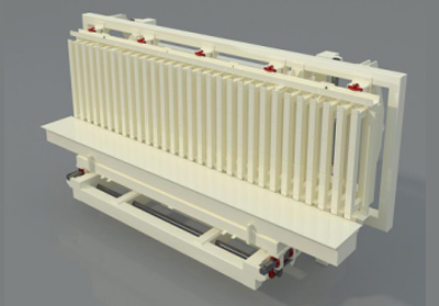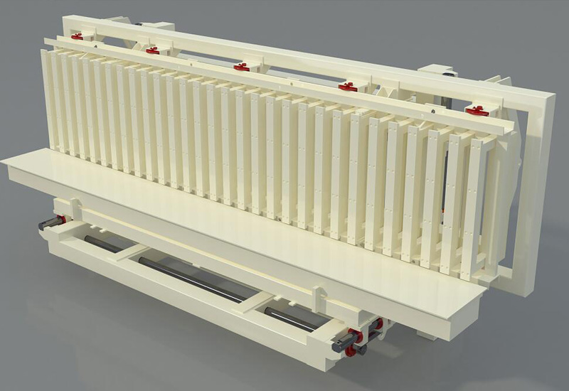 坯體切割底面會有一些廢料。翻轉(zhuǎn)臺將坯體在翻轉(zhuǎn)架上轉(zhuǎn)過90°后,坯體底面切割的表皮由水平位置轉(zhuǎn)變成垂直位置,在重力作用下,自動脫落,坯體表面廢料被去除。翻轉(zhuǎn)臺全部采用液壓驅(qū)動。翻轉(zhuǎn)油缸還具有終點緩沖性能。為了保證蒸養(yǎng)底板、側(cè)板在翻轉(zhuǎn)過程中的穩(wěn)固性,在它們處于翻轉(zhuǎn)位置時側(cè)面都設(shè)有鎖緊機(jī)構(gòu)。