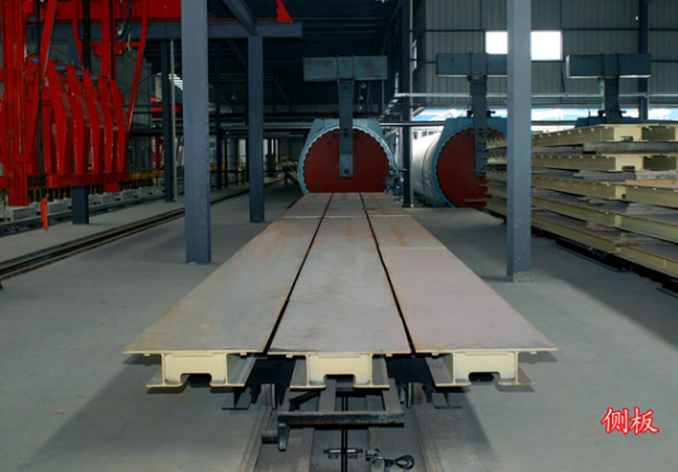 經(jīng)過翻轉(zhuǎn)吊具脫模后,側(cè)板承載加氣磚,切割進釜蒸養(yǎng)直至包裝工段。